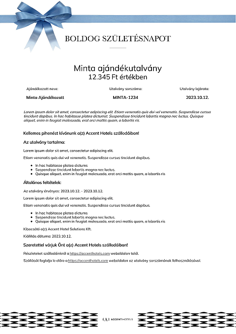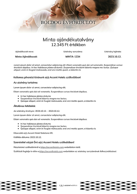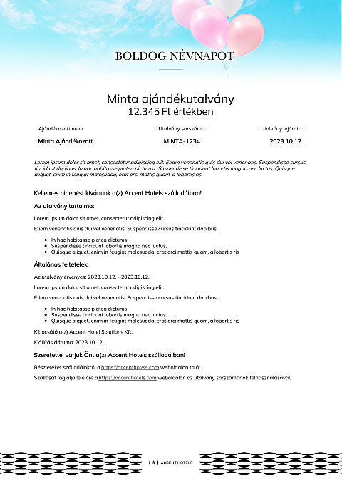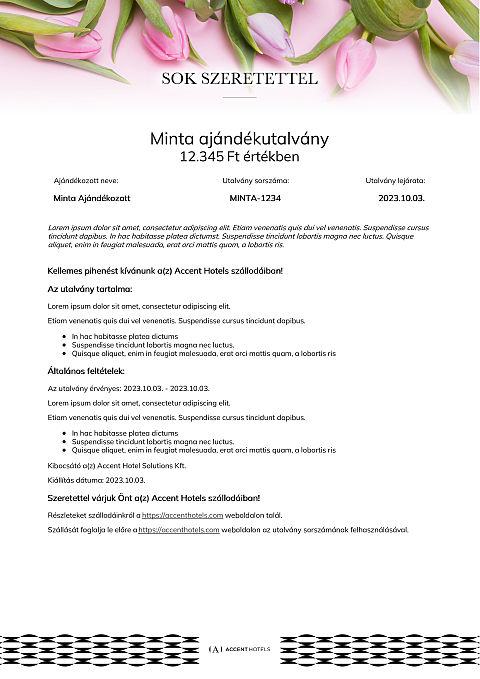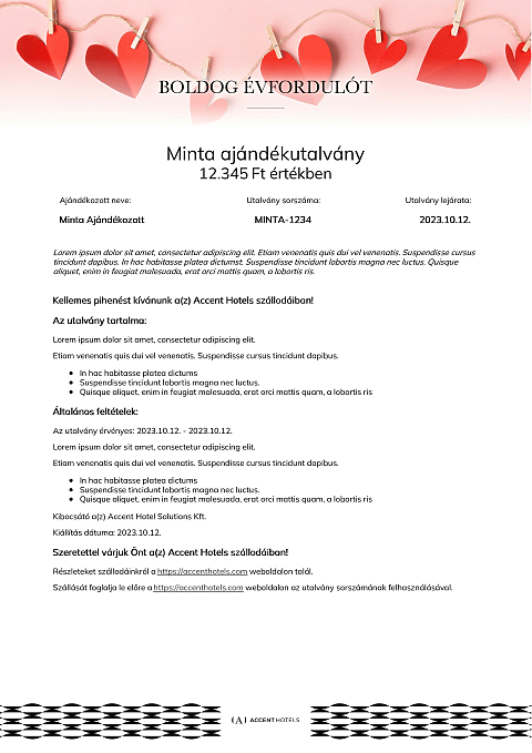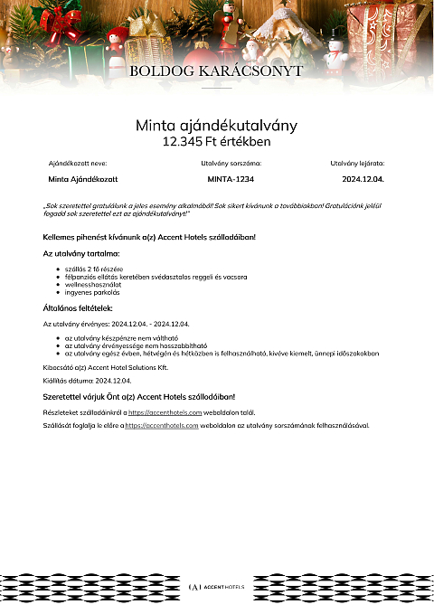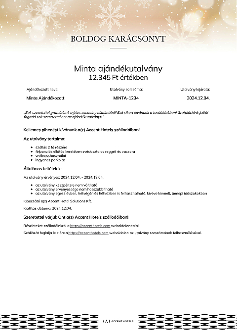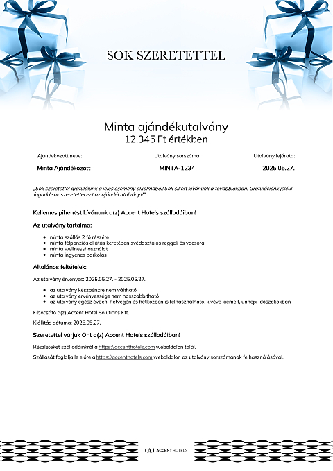 Az utalvány felhasználható bármely szállodában, amely a https://accenthotels.com weboldalon online foglalható. Az utalvány az azon feltüntetett értékig minden olyan számla részben vagy egészében történő fizetésére használható, melyen legalább egy éjszaka szállás szolgáltatás is szerepel.